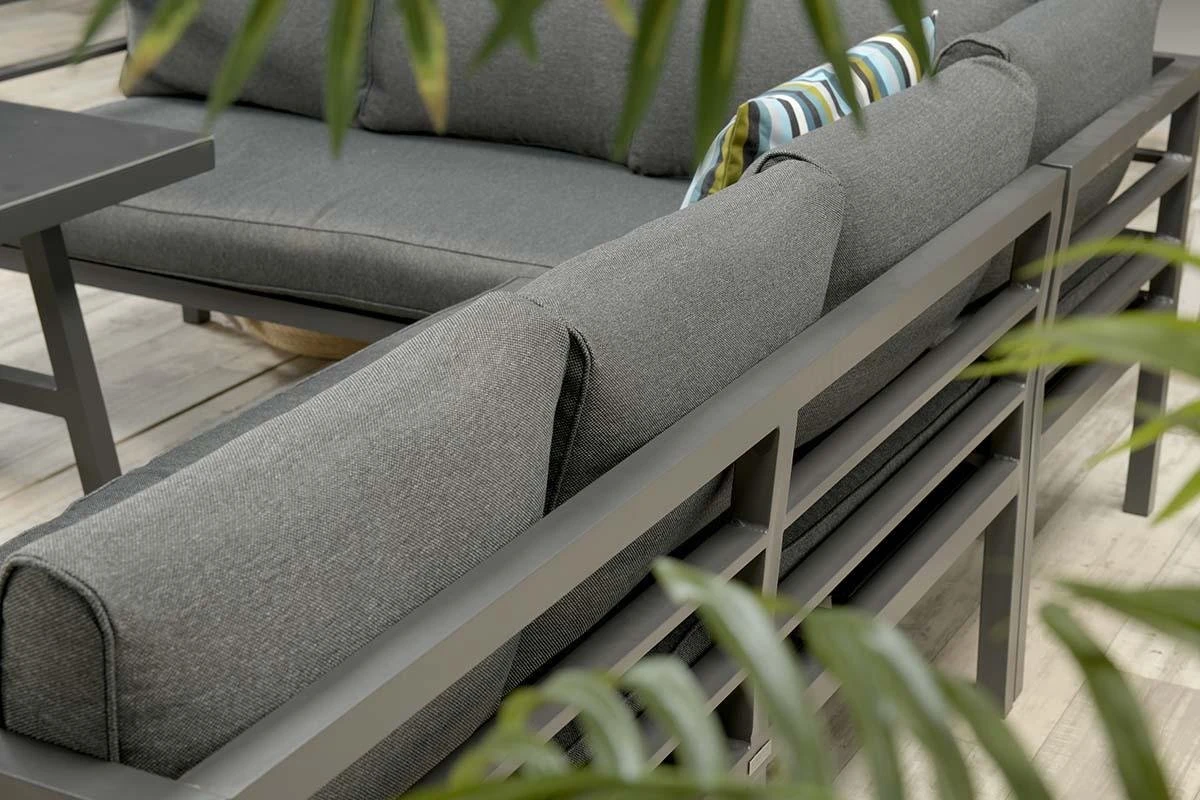 De afmeting van de setopstelling is L 195 x B 245 x H 73 cm, de sportbank: L 120 x B 40 x H 36 cm en de lounge tafel: L 135 x B 80 x H 68 cm. Volledig gemaakt van aluminium met een poedercoat in de kleur carbon black met donker grijze kussens.