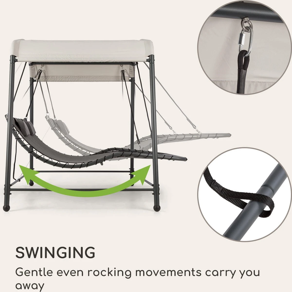 Het robuuste stalen frame geeft het blumfeldt Palermo tweepersoons schommelbed op elk moment de nodige stabiliteit en draagt moeiteloos bij aan je welverdiende ontspanning na een stressige dag. Gewoon achteroverleunen, ontspannen en wegdommelen bij de zacht schommelende bewegingen. Het ligvlak van ademend en eenvoudig te reinigen materiaal is niet alleen bijzonder resistent, maar biedt ook een royaal oppervlak van 130 x 207 cm (BxD) en veel plaats voor gezellig samenzijn. Voor individueel comfort zorgen de twee in hoogte verstelbare hoofdkussens. Het elegante design en de klassieke kleuren introduceren een vijfsterrengevoel bij je thuis. Het grote zonnedak van 200 x 144 cm (BxD), gemaakt van 180g/mยฒ polyester, zorgt betrouwbaar voor schaduw en beschermt je zelfs tegen een regenbui. Schroeven van edelstaal garanderen daarnaast de duurzaamheid van de constructie. Het maximum gewicht van 45 kg en de 4 poten zijn verantwoordelijk voor extra veiligheid en stabiliteit.