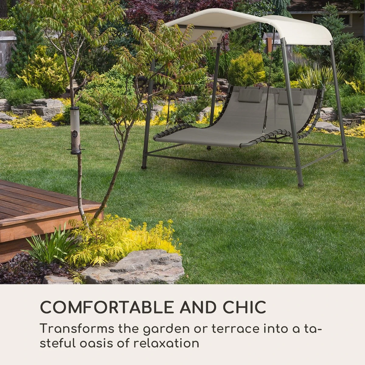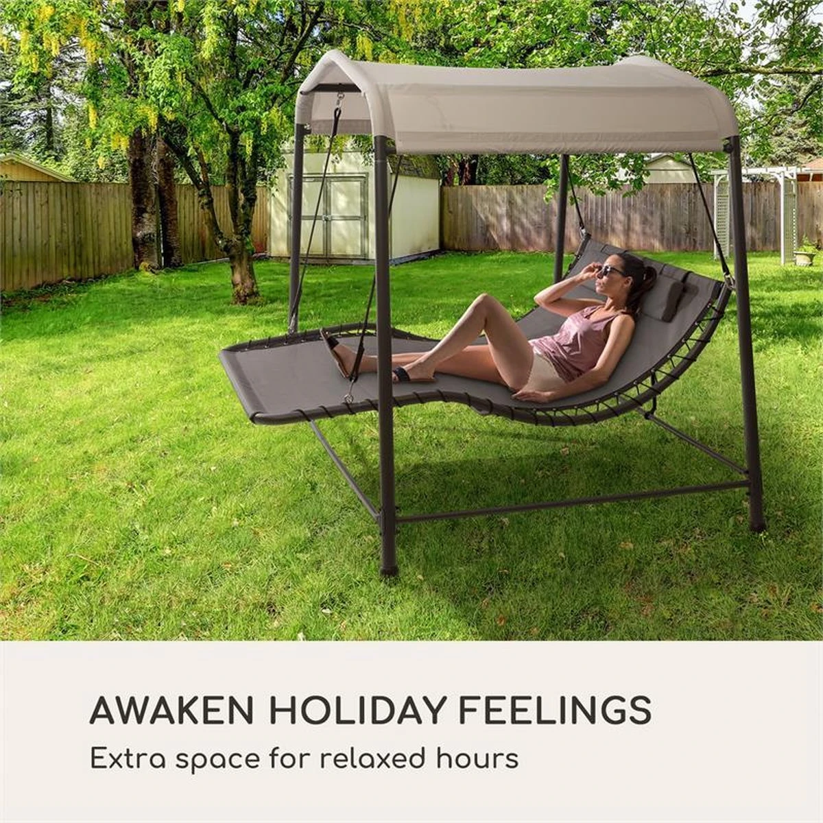 Ontspannen zoals op vakantie. Verander je buitenruimte in een oord van ontspanning en recreatie: Haal dat vakantiegevoel naar huis en geniet op het blumfeldt Palermo dubbele schommelbed van de weldadige rust in je tuin of op je terras.