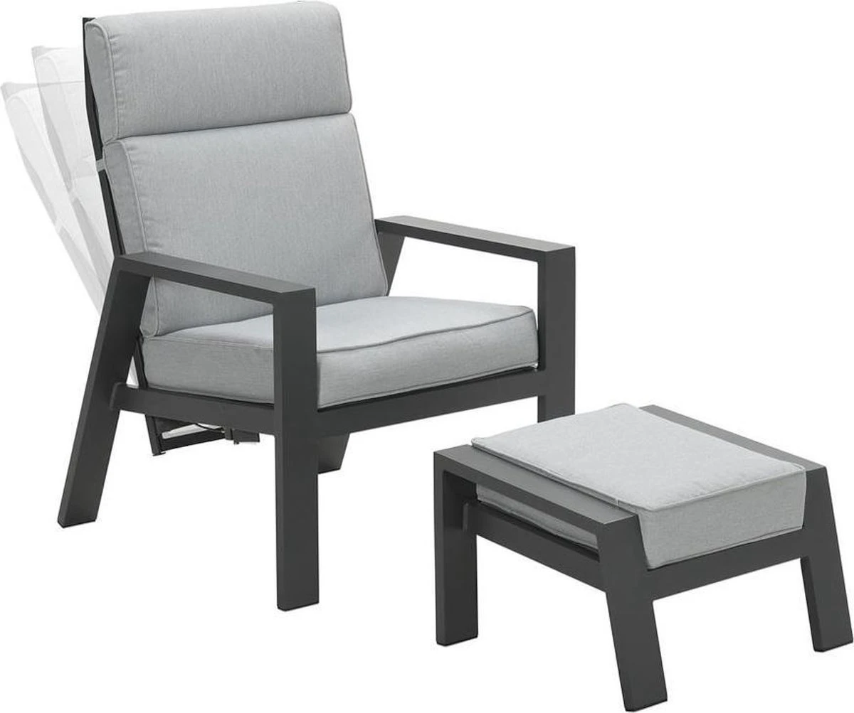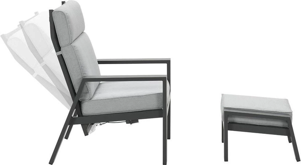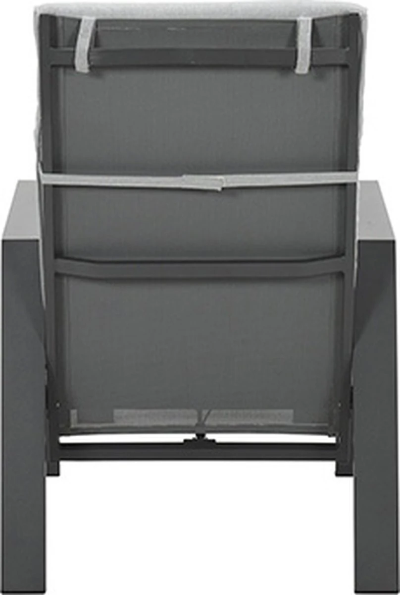 De Lora verstelbare tuinstoel is gemaakt van een stevig en onderhoudsvrij aluminium frame. Dit aluminium frame is voorzien van een sterke donker grijze poeder coating laag. Deze beschermlaag zorgt er voor dat de stoel kras- en stootvast is. Voor de zitting en de rugleuning van deze stoel is gebruik gemaakt van een textilene all-weather doek. Dit doek zorgt voor een fijn zitcomfort, doordat het een beetje meeviert. De Lora tuinstoel met voetenbank worden geleverd met comfortabele licht grijze kussens.