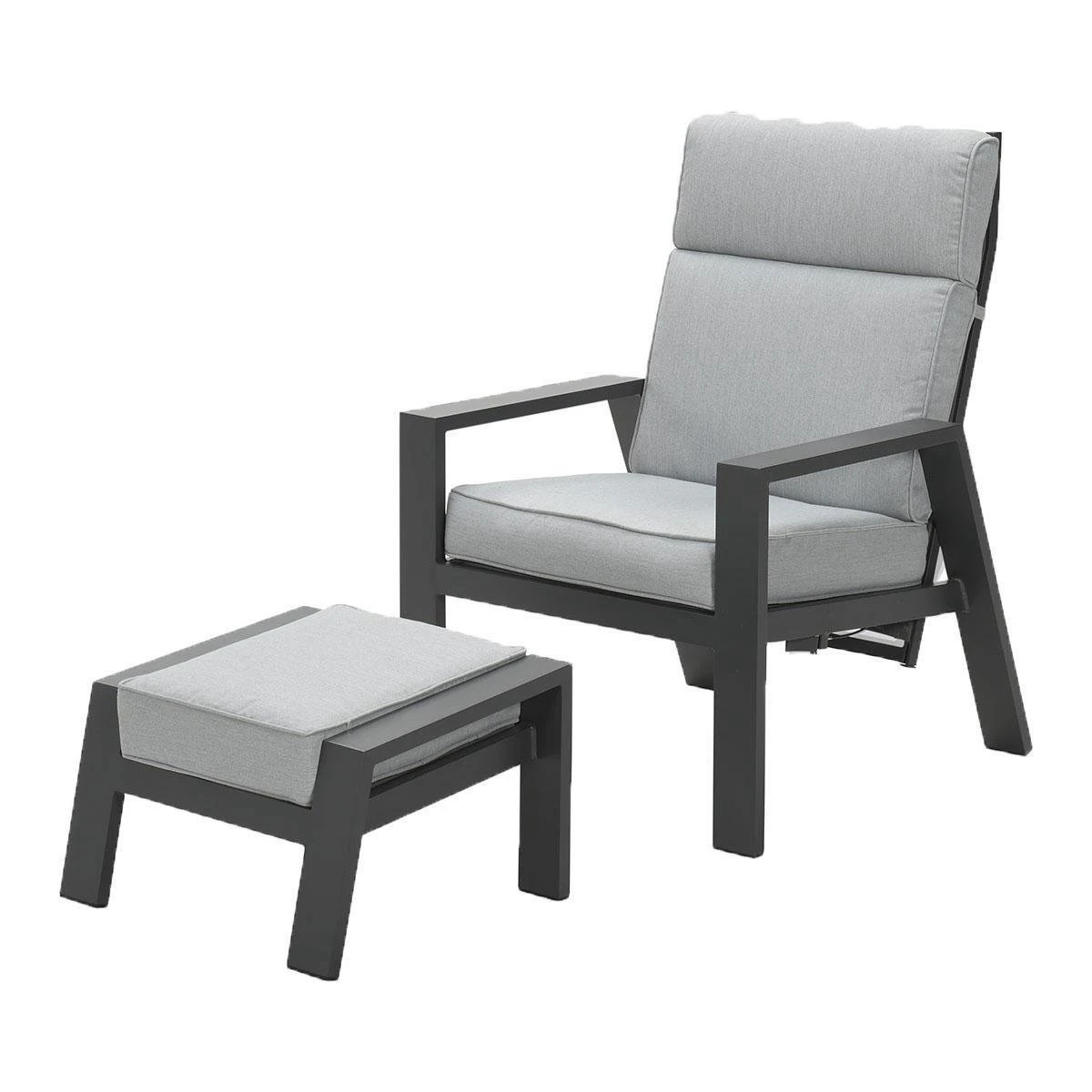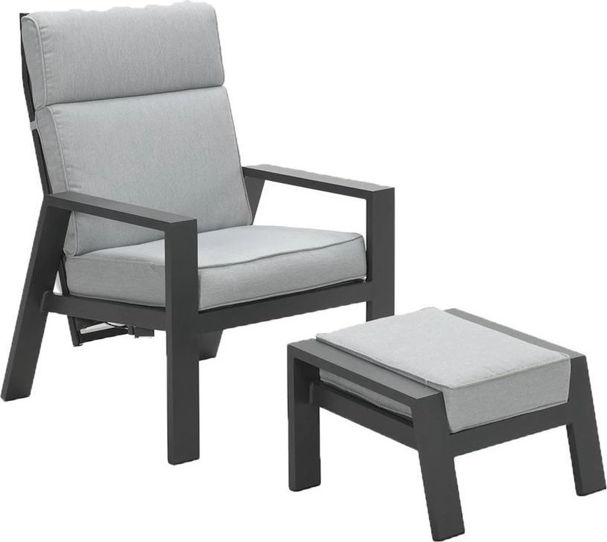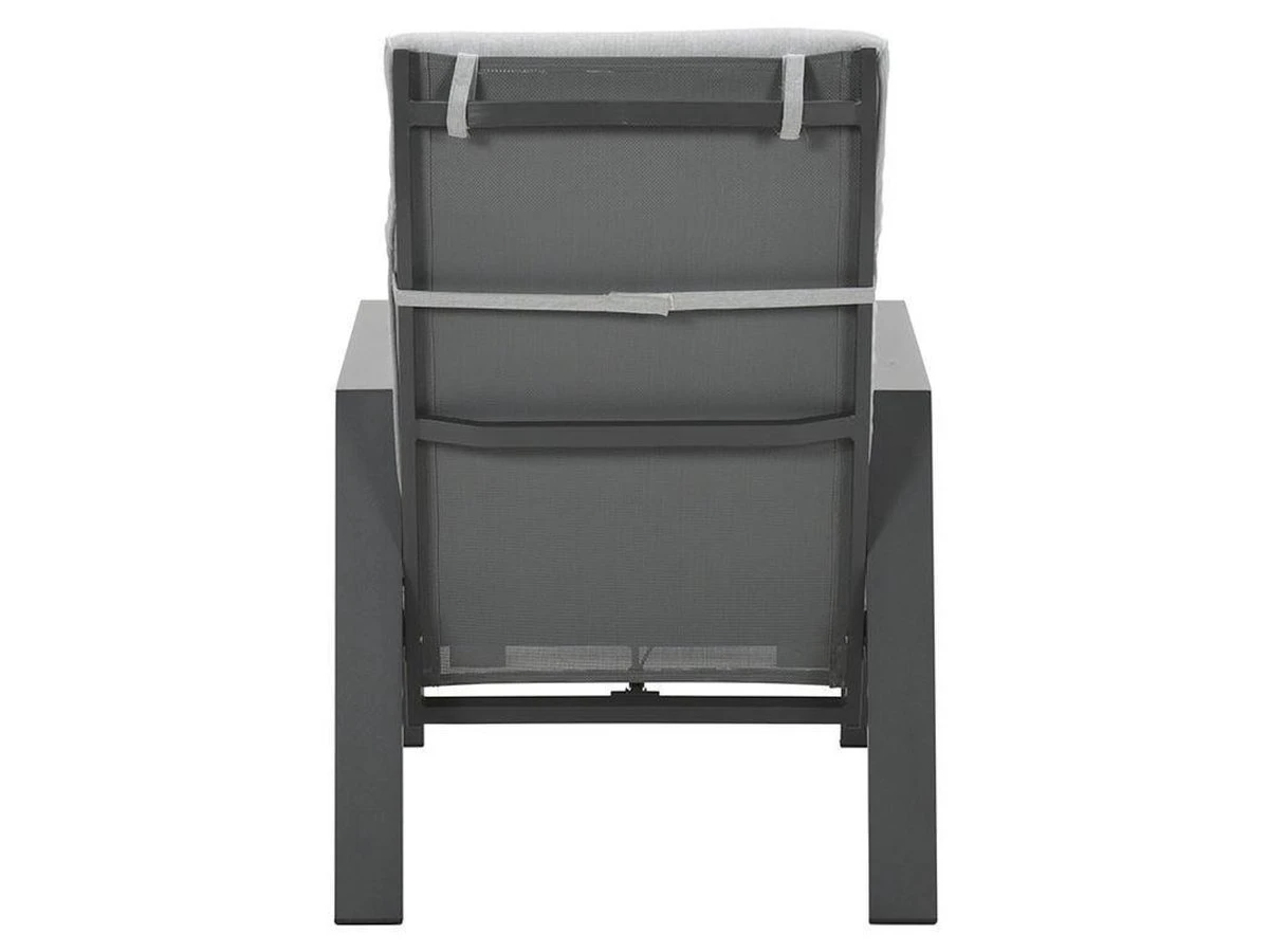 De Lora verstelbare tuinstoel is gemaakt van een stevig en onderhoudsvrij aluminium frame. Dit aluminium frame is voorzien van een sterke donker grijze poeder coating laag. Deze beschermlaag zorgt er voor dat de stoel kras- en stootvast is. Voor de zitting en de rugleuning van deze stoel is gebruik gemaakt van een textilene all-weather doek. Dit doek zorgt voor een fijn zitcomfort, doordat het een beetje meeviert. De Lora tuinstoel met voetenbank worden geleverd met comfortabele licht grijze kussens.