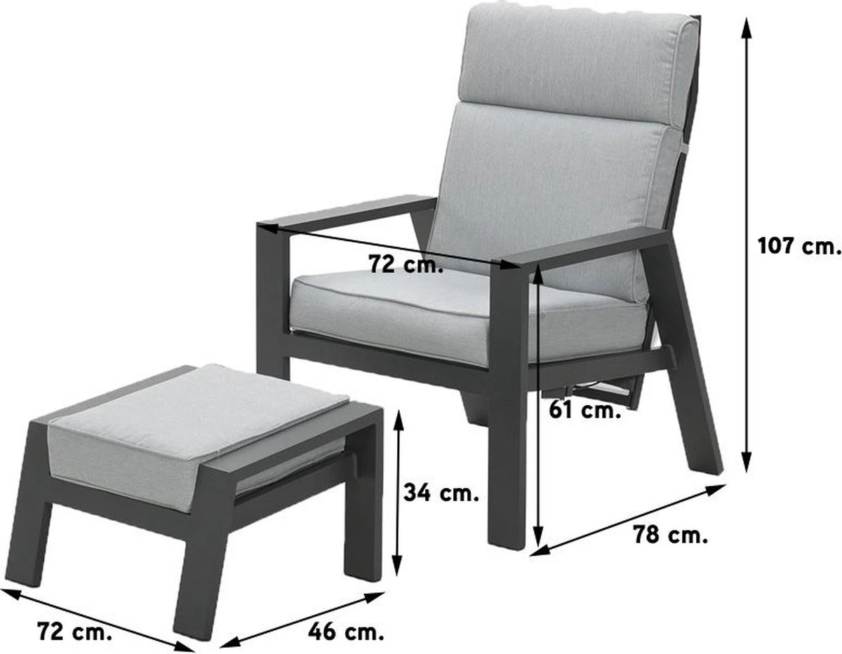 De robuuste verstelbare tuinstoel heeft een unieke uitstraling en een comfortabele zit. De tuinstoel wordt geleverd inclusief voetenbank om heerlijk te kunnen ontspannen. De tuinstoel met voetenbank van kwaliteitsmerk Garden Impressions hebben dikke kussens en een stevig frame. De rugleuning van deze stevige verstelbare stoel zet je met gemak in de gewenste stand naar achteren.
