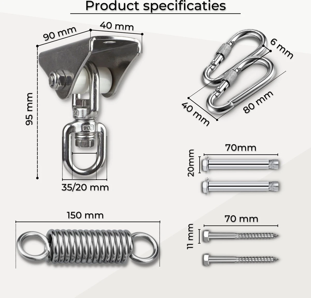 Deze set bied ook mobiliteit op verschillende manieren zoals is de swing van de schommelhaak beweegbaar tot wel 180 ยฐ en kan de beugelkop tot wel 360 ยฐ roteren. Ook bied deze montageset een veer, deze veer bied een lichtelijke veerbeweging bijvoorbeeld in het zitten van een hangstoel, schommel of hangmat. Deze veer โveertโ alleen bij hogere draagcapaciteiten.