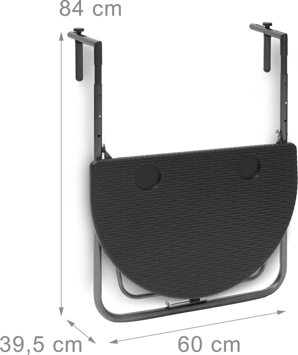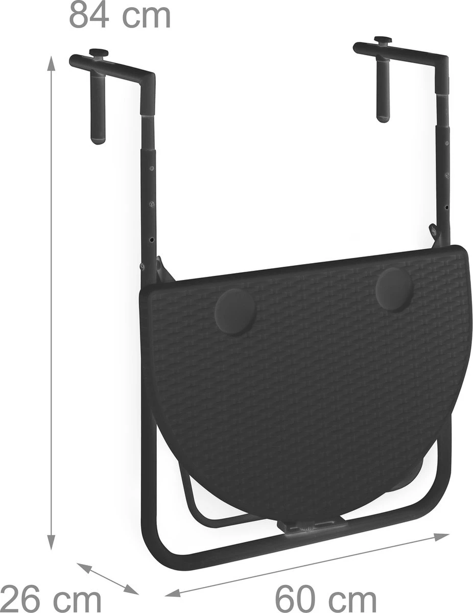 โข Balkontafel opgeklapt met frame H x B x D: ca. 84 x 60 x 26 cm (3 cm afstand van reling)